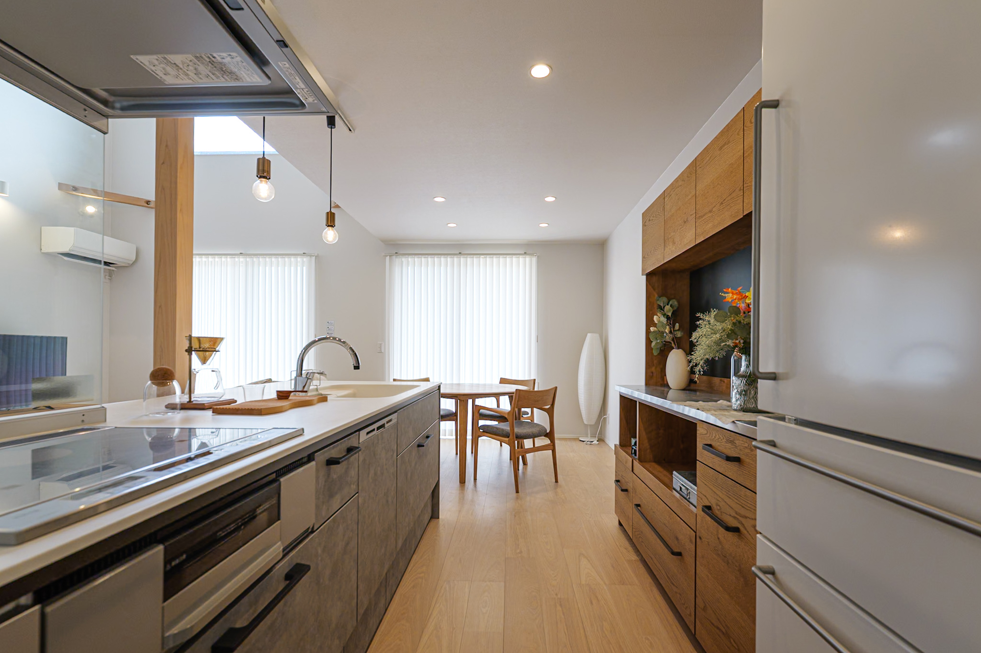 木の質感とグレーカラーが調和するキッチン。背面収納のディスプレイが空間に上質感をプラス。