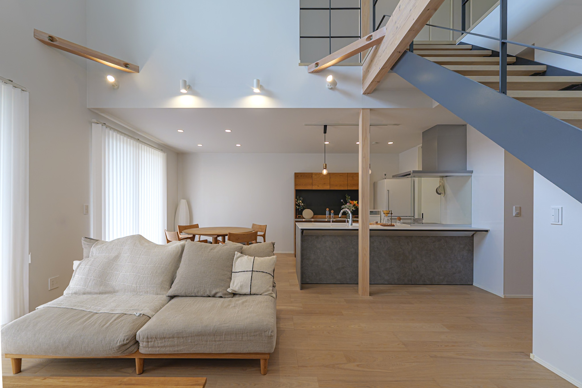 吹き抜けからやわらかな光が降り注ぐ、開放的なLDK空間