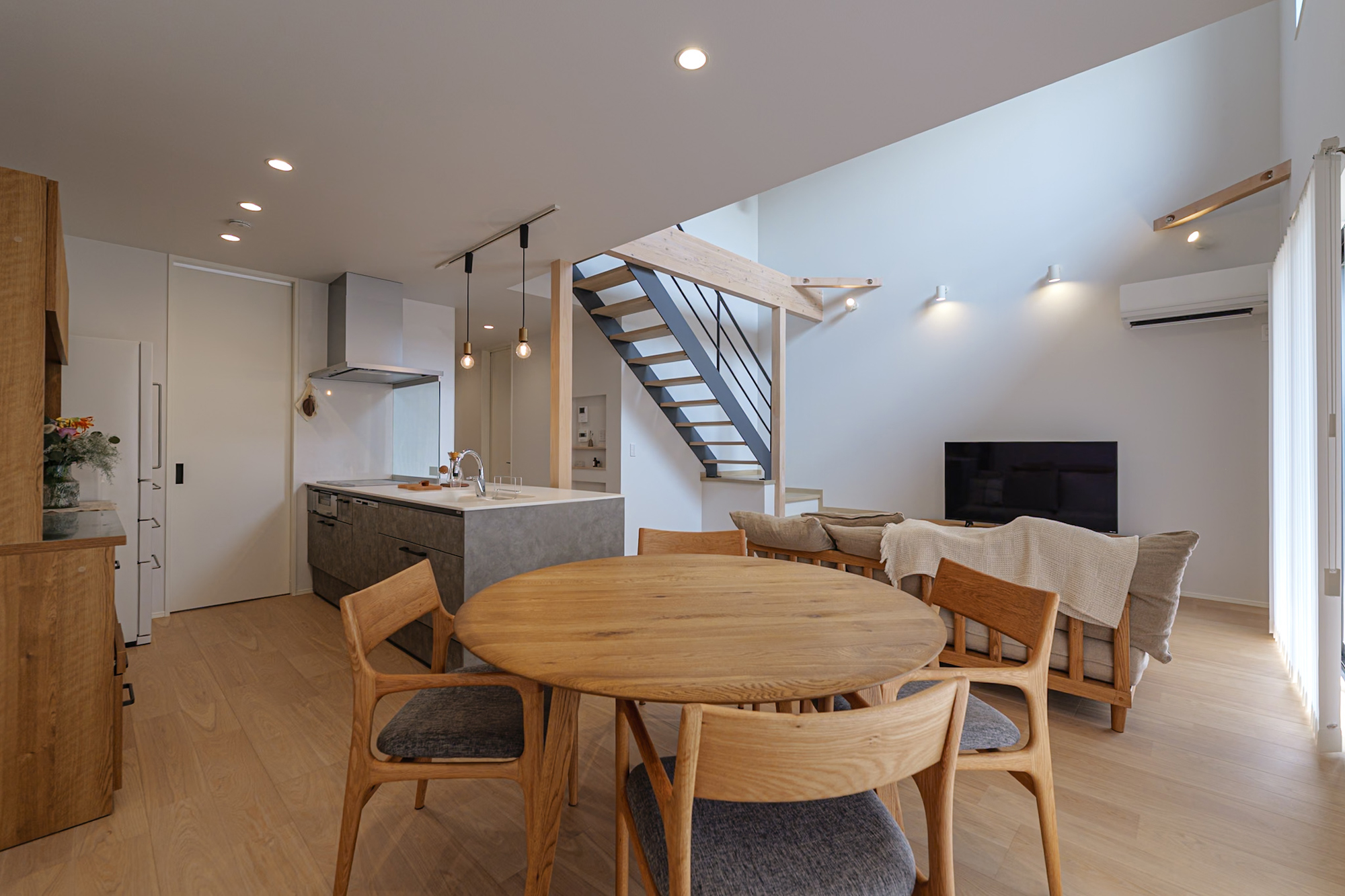 ラウンドテーブルを中心に、キッチン・階段がひと続きになったつながりのある空間設計。