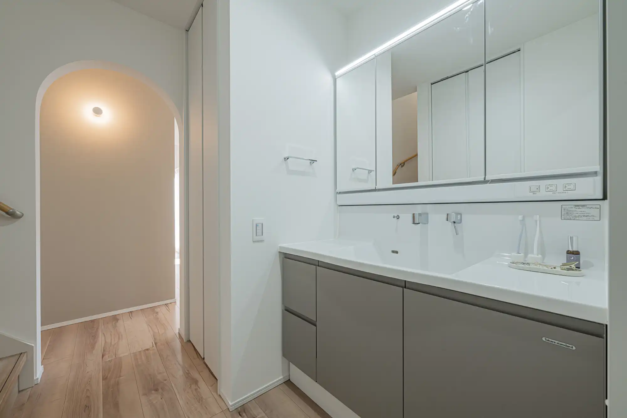水回りを集約した家事ラク動線の要。アーチ状の垂れ壁の向こうにはアクセント壁とブラケットライトを配し、移動の瞬間も心がときめくデザインに仕上げました。