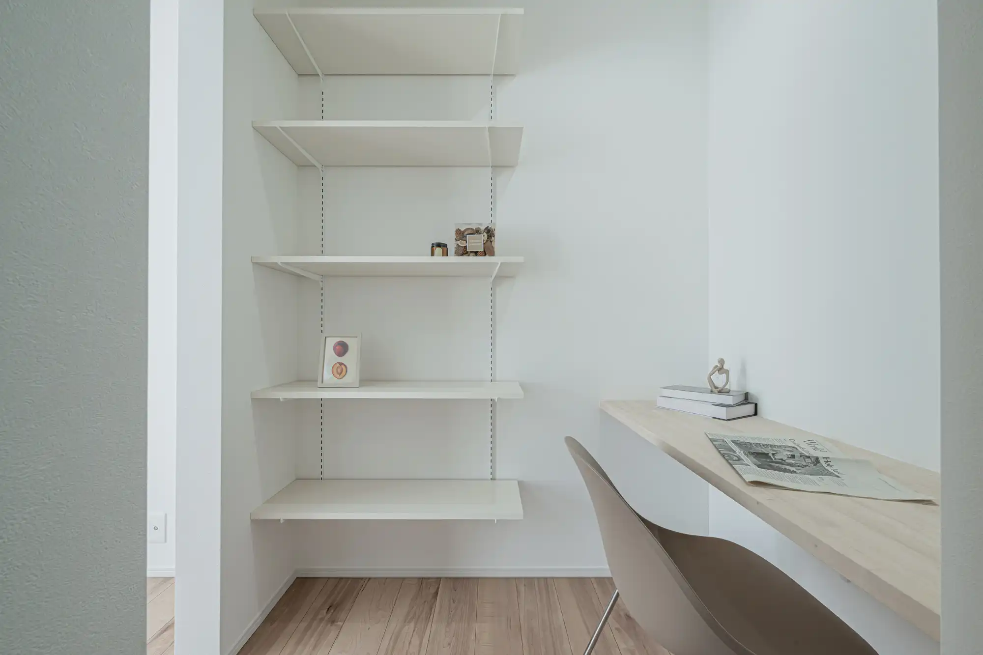 LDKの一角に設けた、可動棚付きのスタディコーナー。リモートワークや趣味の時間、お子様の学習など、多目的に使える「自分らしい」居場所です。
