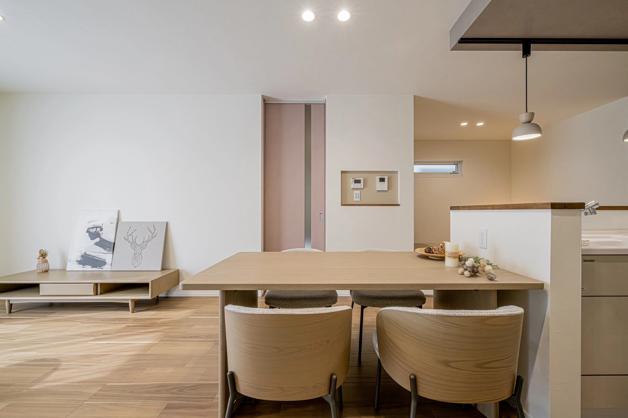 限られた敷地を最大限に活用するため、1階の廊下を可能な限り排除しました。リビングとダイニングを横長につなげることで、視線が抜け、LDKが主役になる開放的な暮らしを叶えています。