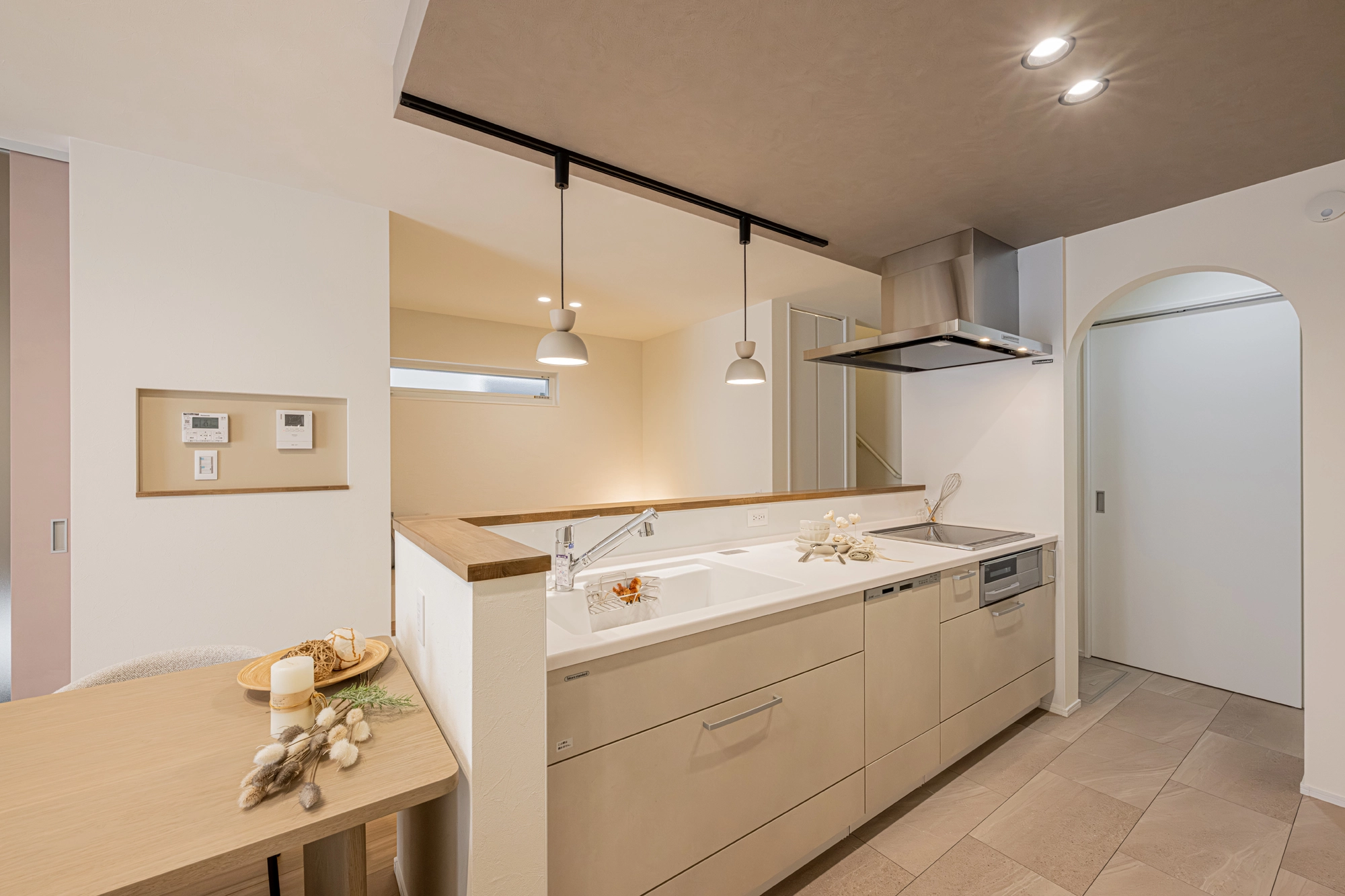 LDK全体を見渡せるキッチンは、テレビを見たりお子様の様子を確認したりしながらお料理が楽しめます。キッチンからパントリー、水回りへと一直線でつながる動線は、共働きで忙しい毎日をサポートします。